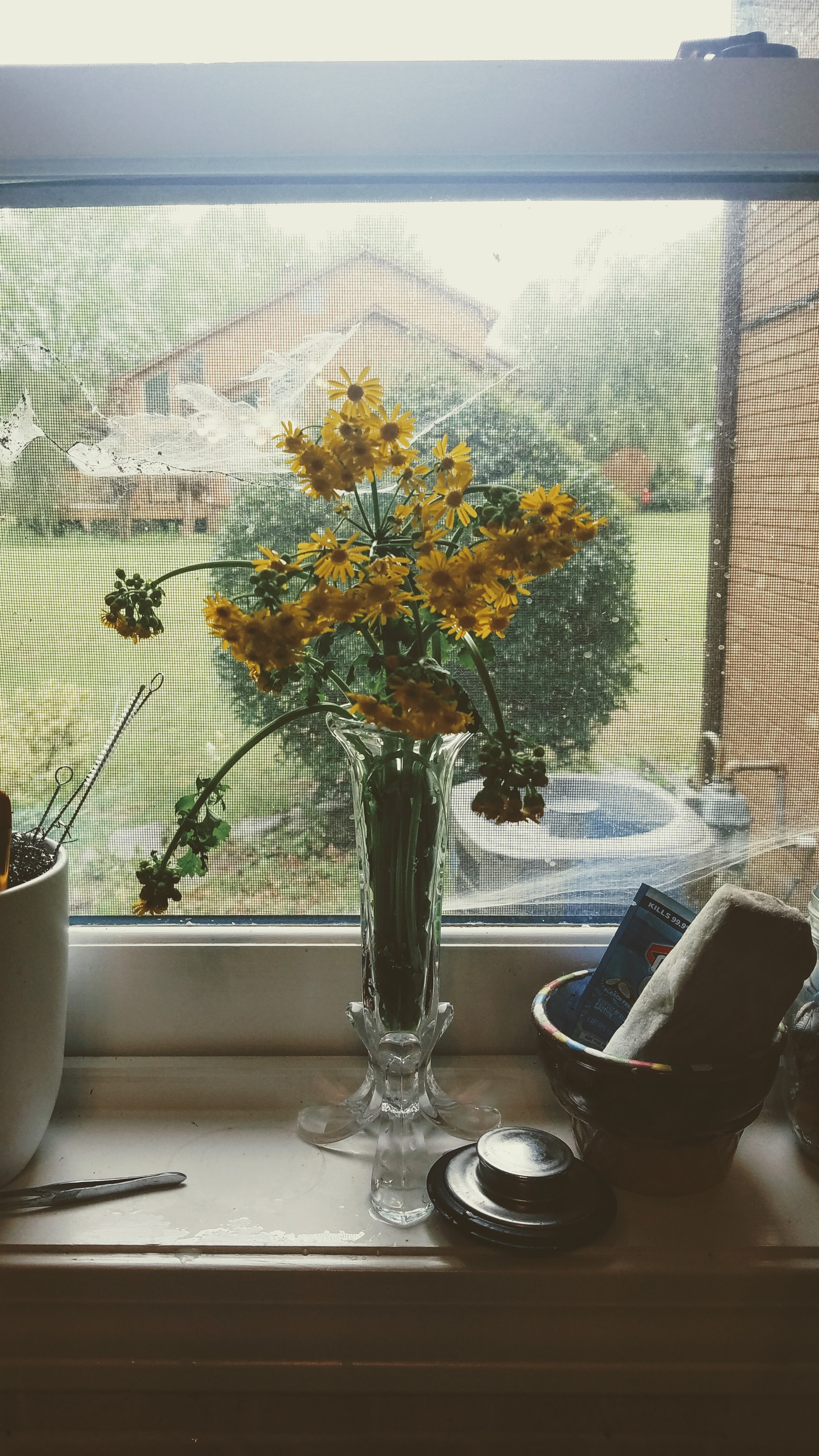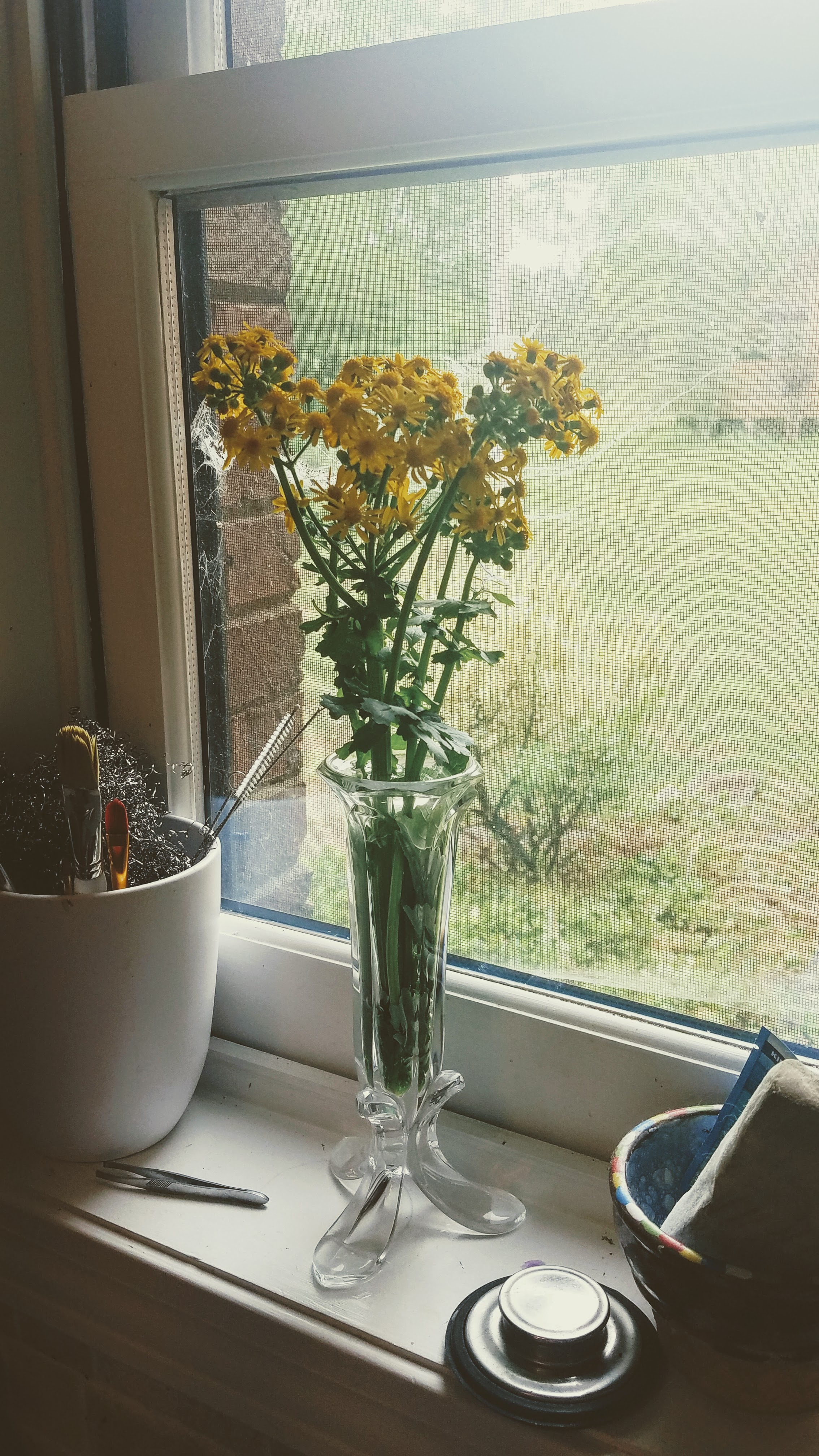 This morning I picked these pretty yellow flowers and put them in this little vase. Within a few hours, they had drank up every drop of the water and wilted. I refilled the vase and within an hour they had perked right back up again.