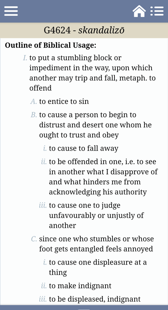 That word “offend” in Matthew 17:27 is the same Greek word as”causes to sin” in Matthew 18:6, 8, and 9 — skandalizō.
