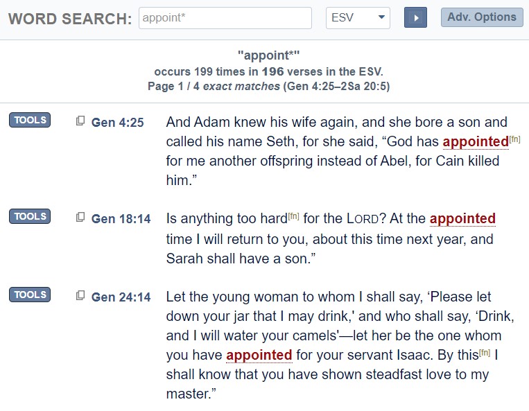 Unfortunately, if I typed in the whole word “appointed,” then I’d only get the exact word “appointed,” and I’d miss “appoint,” “appoints,” “appointing” and so on. So, instead, I typed this: “appoint*”.