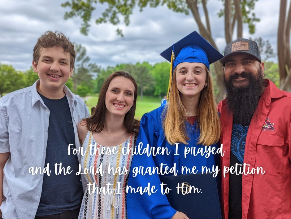 I prayed for each one of my children, the ones waiting for me in heaven, the ones delivered out of my womb, and the one brought to me from a foreign land. Each one of them is a gift from the good, sovereign hand of the Lord. And I have given each of them back to the Lord – not literally, I suppose, but given back to the Lord nonetheless. Ever since they were infants, I’ve seen myself as a steward of God’s creation.