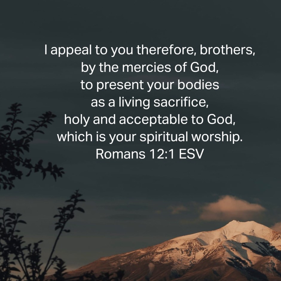 “I appeal to you therefore, brothers, by the mercies of God, to present your bodies as a living sacrifice, holy and acceptable to God, which is your spiritual worship.”