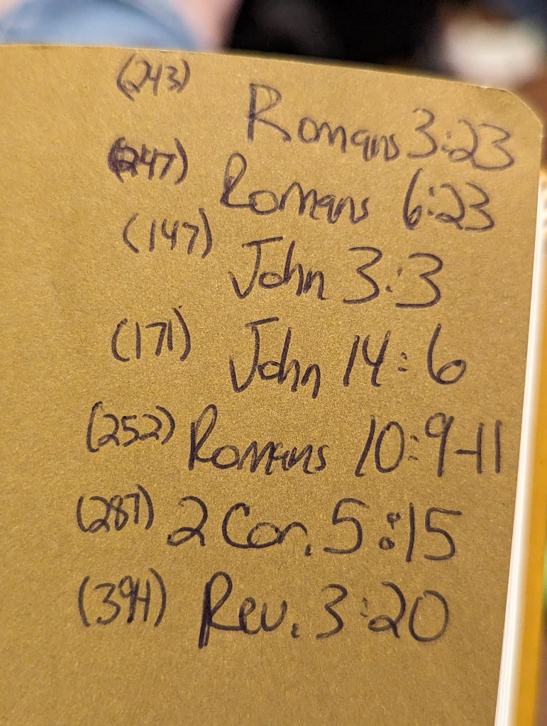 I want to always be prepared to give away this pocket Bible, so I also wrote several key passages in the cover that are excellent for non-Christians or new Christians to study. I actually keep a second pocket Bible ready at home with these verses written in it, too, so when I give this one away, I’m already prepared to pop another one into my purse. I learned these passages from No Place Left ministries whose website has lots of great resources for evangelism and discipleship.