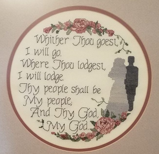My grandma made this for me as a wedding gift. Ruth 1:16.