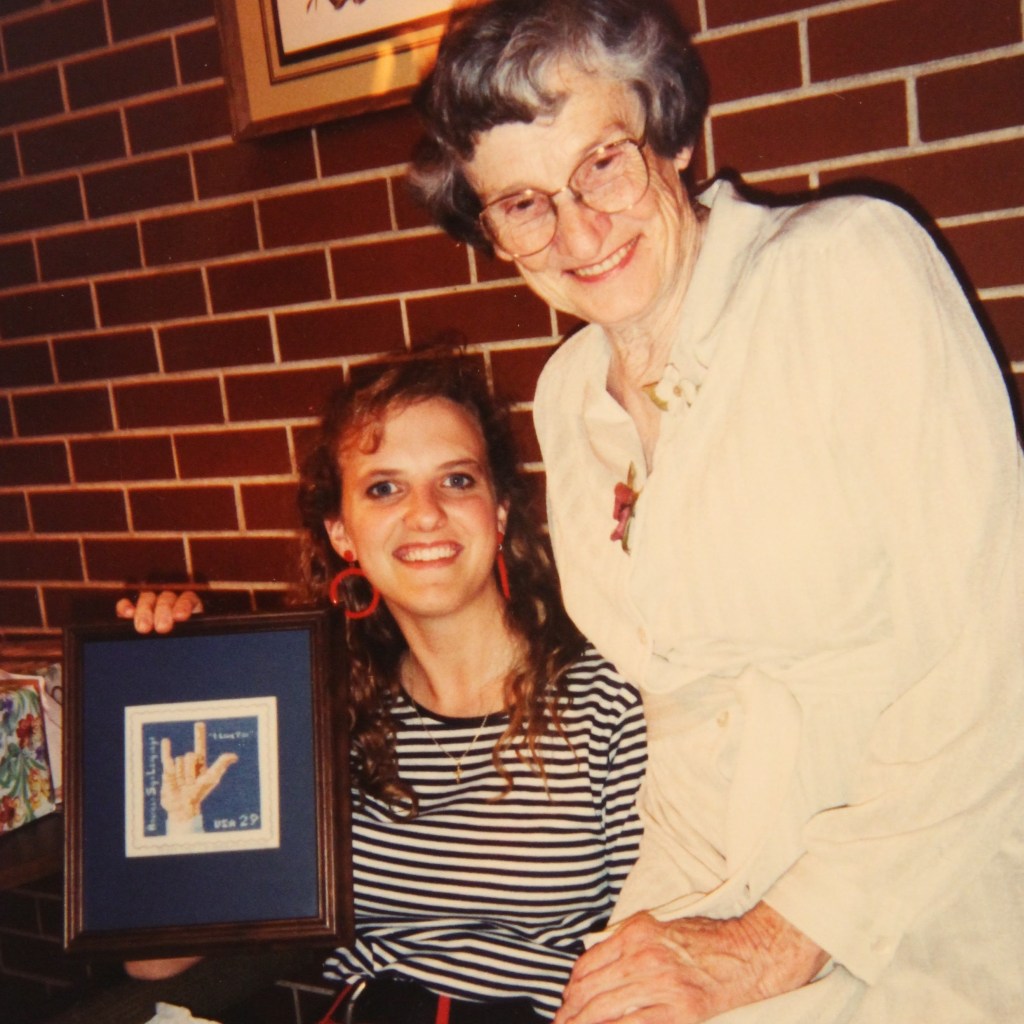 As a college graduation gift, Grandma Norma gave me this cross-stitched picture of an American Sign Language postage stamp.
